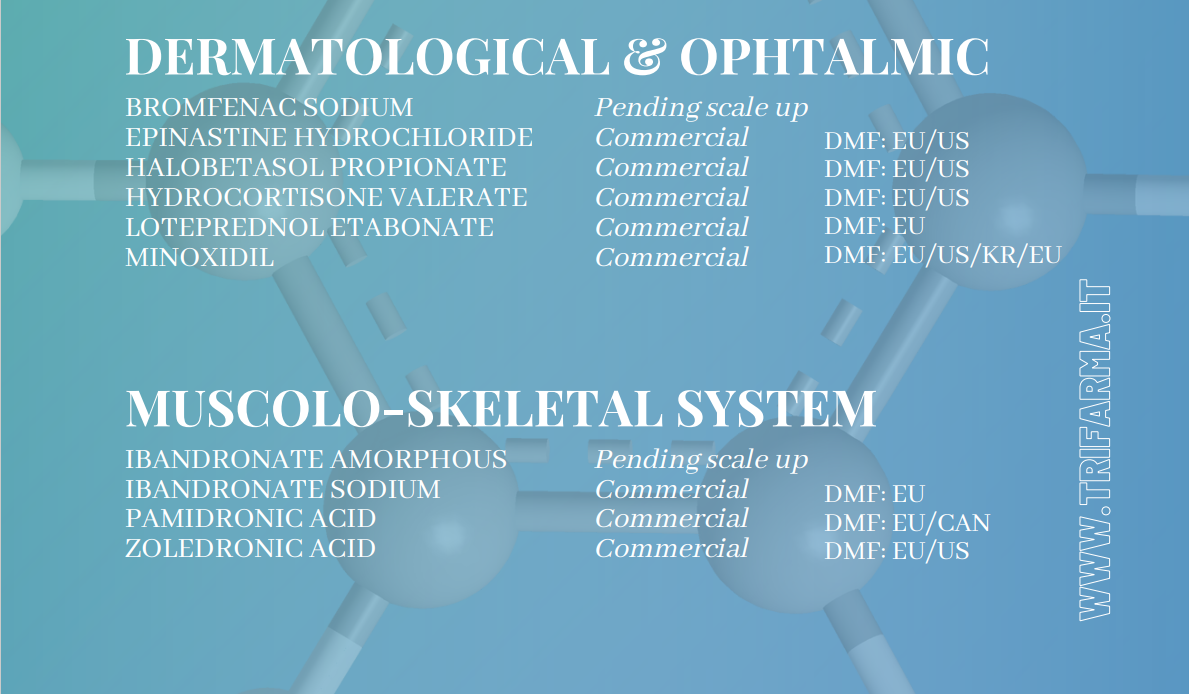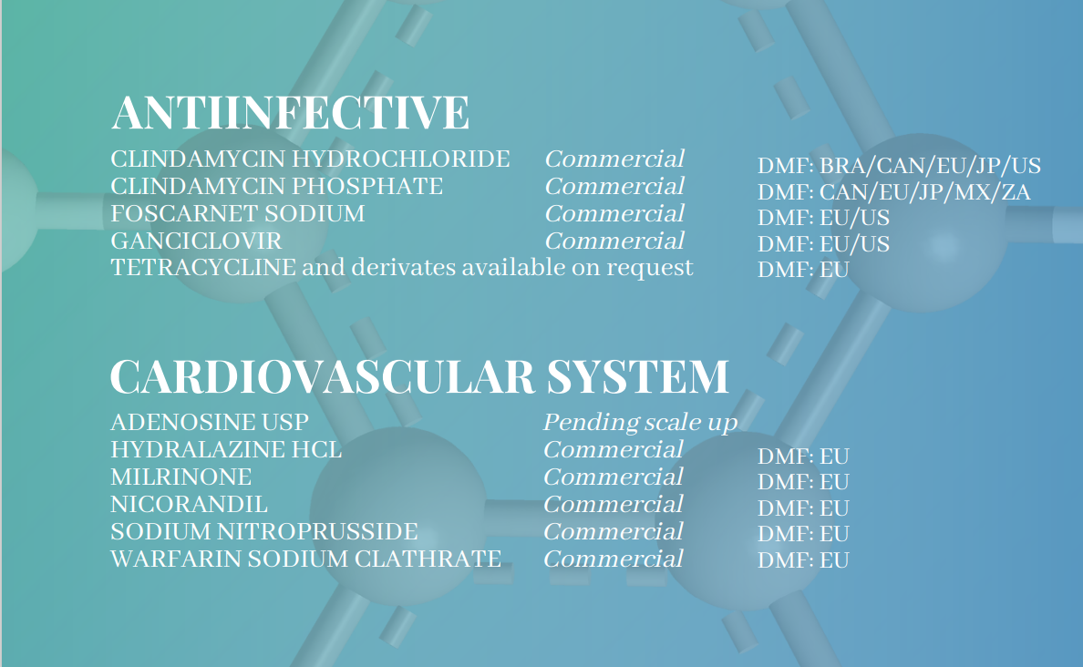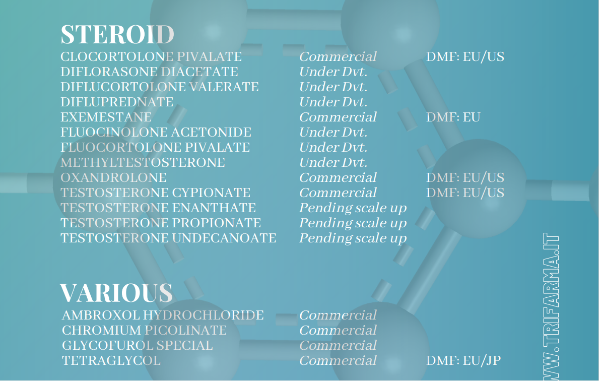 At Trifarma, we specialize in creating and producing top-quality Active Pharmaceutical Ingredients (APIs) in Italy and India. Our focus is on providing safe and effective solutions for the global pharmaceutical market. We have a wide range of APIs that are approved by regulatory bodies, as well as APIs that are still in the research and development phase. Additionally, we offer custom-made APIs, solvents, and intermediates to meet the specific needs of our customers. Our manufacturing facilities in Italy and India are equipped with the latest technology to ensure that our products meet the highest quality standards. We are committed to providing excellent customer service and are dedicated to meeting the unique needs of each of our clients worldwide.